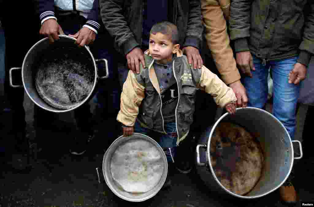 A Palestinian boy holds cooking pots during a protest against aid cuts, outside United Nations' offices in Gaza City.