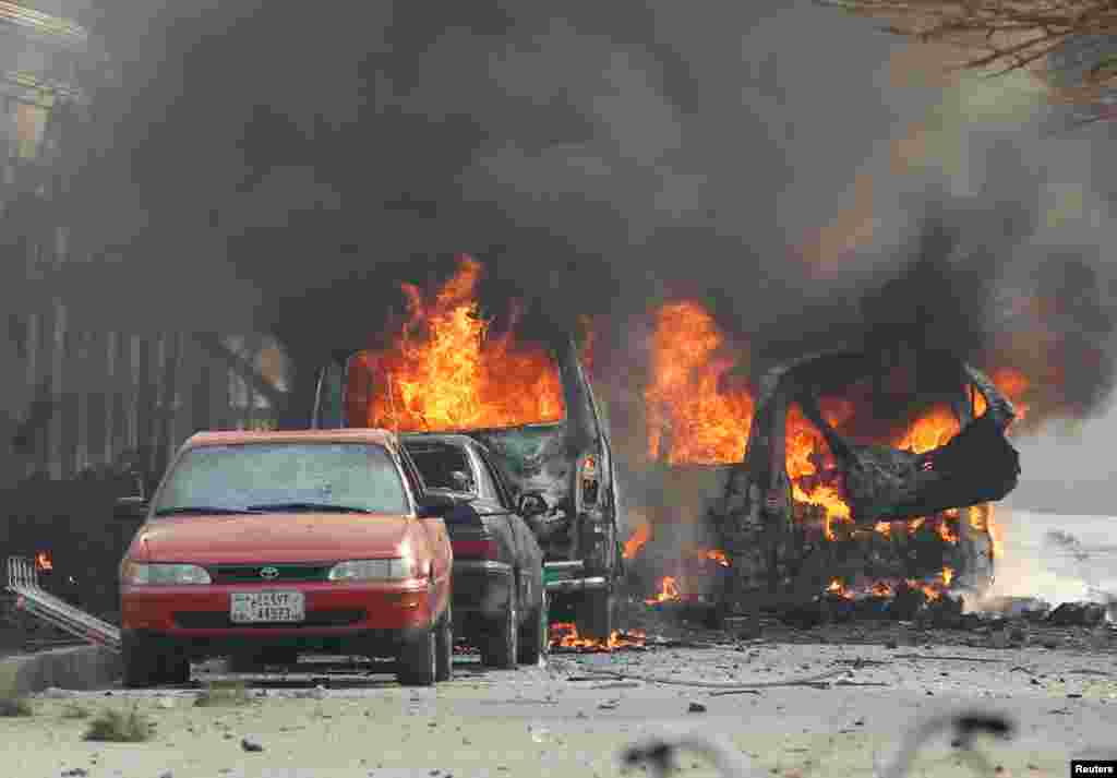 Vehicles engulfed in flames can be seen after a suicide bomber detonated a car bomb in Jalalabad, Afghanistan.