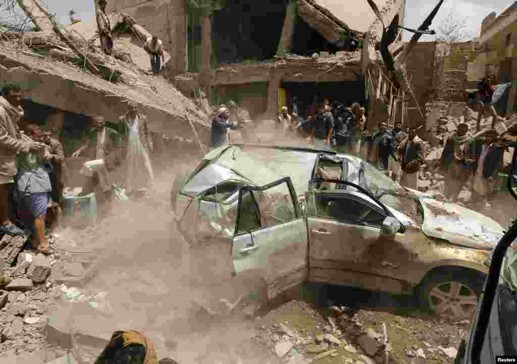 A crane drops a car at the site of a Saudi-led airstrike in Yemen's capital Sana'a.